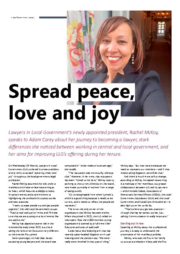 Lawyers in Local Government’s newly appointed president, Rachel McKoy, speaks to Adam Carey about her journey to becoming a lawyer, stark differences she noticed between working in central and local government, and her aims for improving LLG’s offering during her tenure.