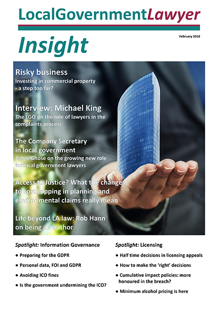 This article was first published in the February edition of Local Government Lawyer Insight, which can be accessed at http://www.localgovernmentlawyer.co.uk/insight Insight is published four times a year and is circulated free-of-charge to all Local Government Lawyer newsletter subscribers (click here to subscribe) in electronic format. A single hard copy is also circulated to all local authority legal departments in England and Wales. Additional printed copies are available for just £49.95 for four issues. Multiple copies are also available at £149.95 for five or £249.95 for 10. Payment can be made by purchase order/invoice or by credit/debit card. To order, please call 0207 239 4917 or email |